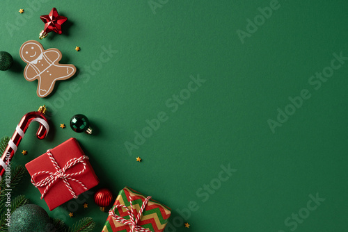 © ActionGP, Obraz premium Festive Christmas scene with a gingerbread man, candy cane, and neatly wrapped gifts on a deep green background. Perfect for holiday, celebration, season, greeting, and seasonal gift ideas