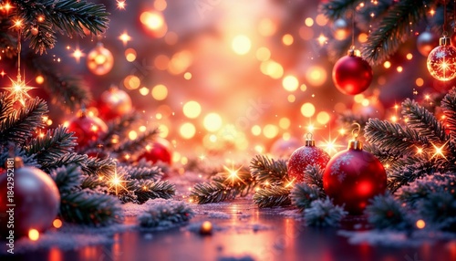Fototapeta premium Festive Christmas scene with sparkling lights and red ornaments