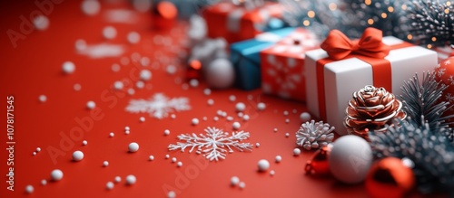 Fototapeta premium Festive Christmas Scene with Wrapped Gifts, Snowflakes, and Pine Cones on a Red Background with Sparkling Lights.