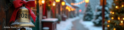 Fototapeta premium Festive christmas street with snowy decor and bell ringing in 2020 holiday...