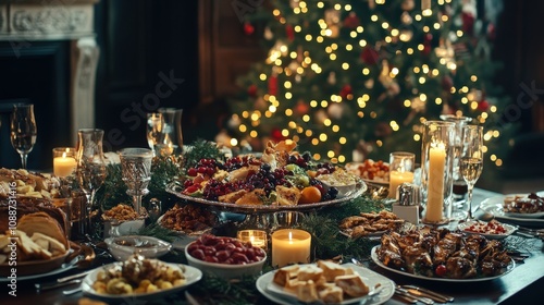 Naklejka premium Festive Christmas Table Setting with Abundant Food and Decorations