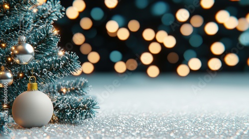 © Narongsag, Obraz premium Festive Christmas Tree Branch with Ornaments Glittery Background Holiday Decor