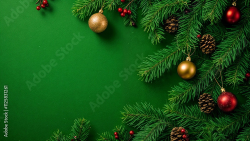 Fototapeta premium Festive Christmas Tree Branches Adorned with Ornaments on Green Holiday Background Illustration