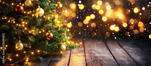 Naklejka premium Festive Christmas tree decorated with lights against a blurred backdrop of a...