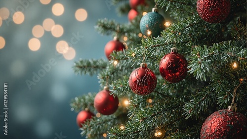 © Ruben, Fototapeta premium Festive Christmas tree with colorful baubles and twinkling lights for holiday promotions