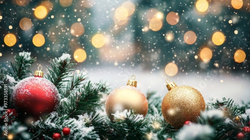 © Diffin, Obraz premium Festive Christmas tree with decorations with glittery baubles, frosted evergreen branches, illuminated by warm lights on a blur background. Merry Christmas banner and poster