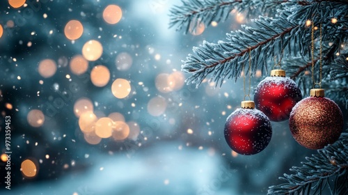 © Diffin, Obraz premium Festive Christmas tree with decorations with glittery baubles, frosted evergreen branches, illuminated by warm lights on a blur background. Merry Christmas banner and poster