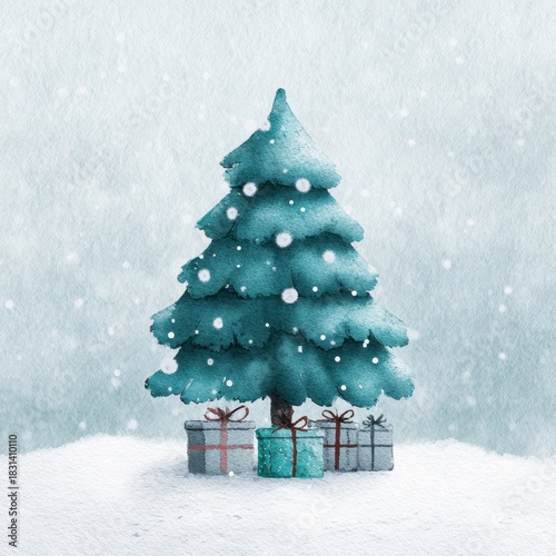 Naklejka premium Festive Christmas Tree with Gifts in Snowy Winter Scene