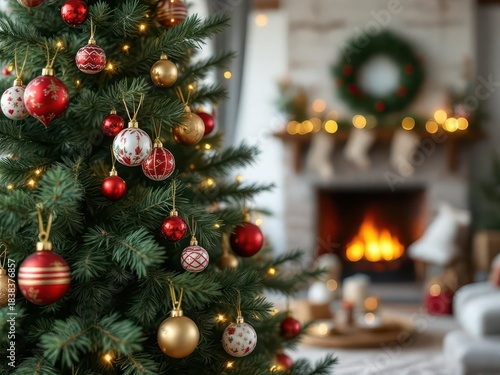 Fototapeta premium Festive Christmas Tree with Ornaments and Warm Fireplace Background