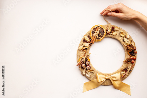 Fototapeta premium Festive Christmas wreath. New year decoration background