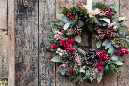 © Macrostock, Fototapeta premium Festive Christmas wreath with berries and pine cones hanging on a rustic wooden door perfect for holiday decorations