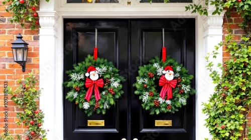 Fototapeta premium Festive Christmas Wreaths Adorn Elegant Black Double Doors in an English...