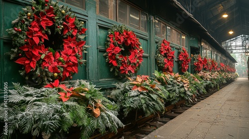Naklejka premium Festive Christmas Wreaths Adorn Historic Train Station