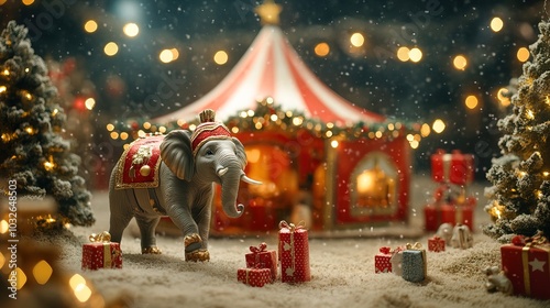 © Alief Shop, Fototapeta premium Festive circus-themed christmas scene with tent, elephant, and gifts