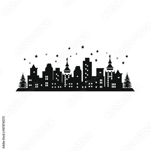 Obraz premium Festive city skyline silhouette with snowflakes and trees