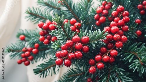 © DEER FLUFFY, Fototapeta premium Festive close up of evergreen branches with vibrant red berries.