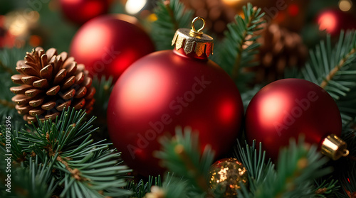 Fototapeta premium Festive Close-Up of Traditional Red Matte Christmas Ornaments Pine Cones and Green Pine Needles