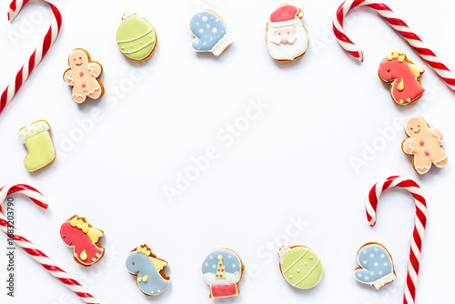 Fototapeta premium Festive composition of Christmas and New Year gingerbread cookies and Christmas Candy Canes on white background, top view. Greeting concept