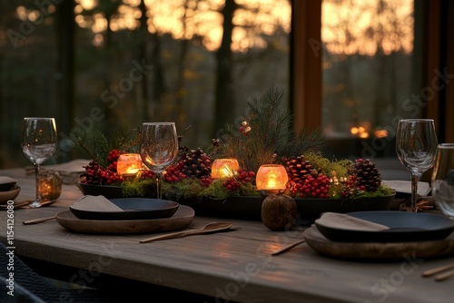 Fototapeta premium Festive dining table decorated with candles and natural elements during sunset in a cozy setting