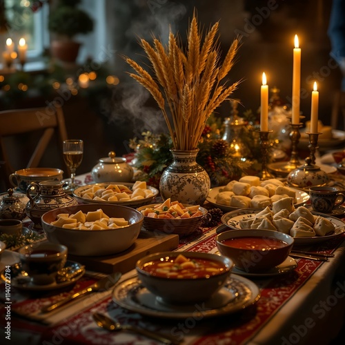 © Justice, Fototapeta premium festive dinner table in the Ukrainian Christmas theme. Decorations include candles, wreaths and holiday cards, creating a warm and cozy atmosphere.