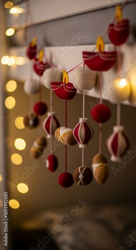 © Dian, Obraz premium Festive Diwali garland with diyas, lanterns, and acorns hanging from a shelf.