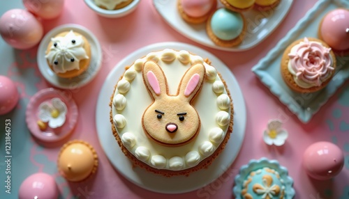 © Janis, Obraz premium Festive Easter Bunny Cake with Pastel Desserts, Ideal for Holiday Celebrations