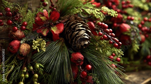 © Adip, Fototapeta premium Festive evergreen boughs, pine cones, and berries create a natural holiday decoration.