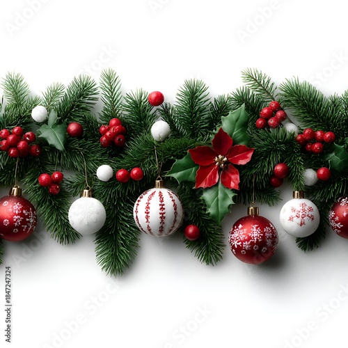 © Anuson, Fototapeta premium Festive evergreen garland adorned with red and white ornaments, berries, and poinsettias on a white background creates a cheerful holiday scene.