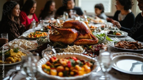 © Bisera, Naklejka premium Festive family Thanksgiving meal with roasted turkey and traditional dishes
