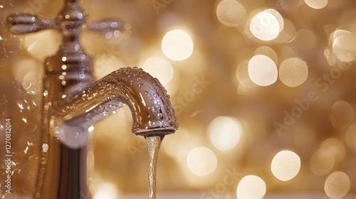 Naklejka premium Festive faucet, water flowing, bokeh lights, bathroom