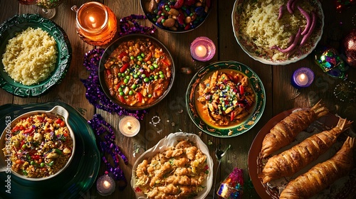 © Farid, Fototapeta premium Festive feast with various dishes on a wooden table.