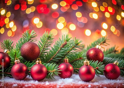 Obraz premium Festive Fir Branches & Christmas Ornaments on Red Glitter Background