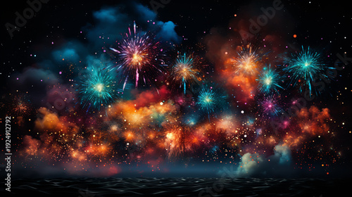 Fototapeta premium Festive firework rockets bursting in big sparkling star balls poster with black background abstract illustration