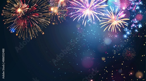 © wanna, Fototapeta premium Festive fireworks background with black copy space,