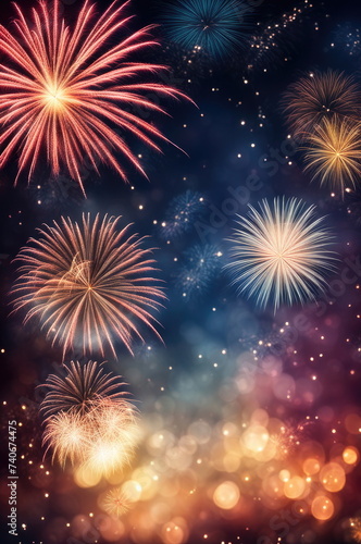 Naklejka premium Festive Fireworks Bursting with Glittering Bokeh on Night Sky