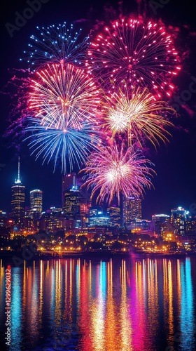 © Lemdah, Fototapeta premium Festive fireworks explode over city skyline