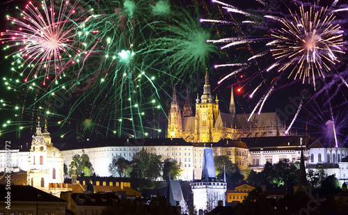 © Konstantin Kulikov, Fototapeta premium Festive fireworks over Prague hail, Prague, Czech Republic