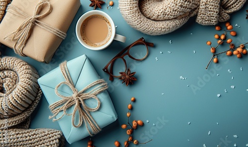 Naklejka premium festive flat lay composition with coffee gifts glasses,tie on blue backdrop...