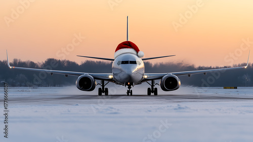 © photo for everything, Obraz premium Festive flight! An airliner taxis down the runway, playfully sporting a Santa hat on its nose. The winter sky glows softly in the background, marking a Christmas journey.