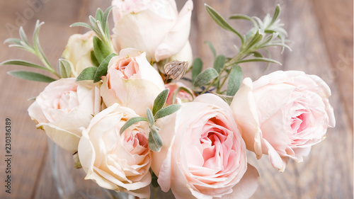 © Olga Ionina, Fototapeta premium Festive flower English rose composition on the white background. Overhead top view, flat lay. Copy space. Birthday, Mother's, Valentines, Women's, Wedding Day concept.
