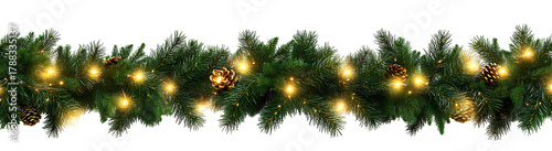 © A2Z Color Mk, Obraz premium Festive Foliage Garland with Pine Cones and Bright Lights on Transparent Background