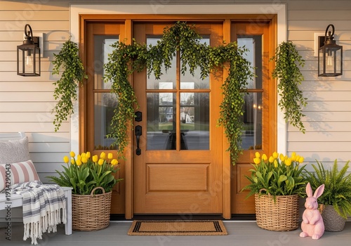 © gankevstock, Fototapeta premium Festive front door decorated for spring with tulips and greenery