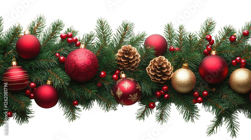 Fototapeta premium Festive Garland: A vibrant garland adorned with red and gold ornaments, pinecones, and berries, symbolizing the joy and anticipation of the holiday season.