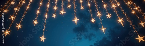 Naklejka premium Festive garland of stars hangs against dark blue sky. Holiday illumination glows, twinkles creating magical ambience. Decorations shine with bright light bringing joy, cheer. Festive mood for everyone