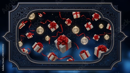 Obraz premium Festive gifts and glowing ornaments in a decorative frame
