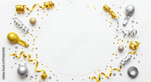 Fototapeta premium Festive Gold and Silver Party Decorations Frame on White Background with Copy...