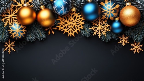 Fototapeta premium Festive gold & blue baubles, snowflakes, pine branches on dark background....