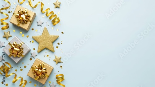 Fototapeta premium Festive golden and silver gift boxes with sparkling stars and ribbons on a light blue background