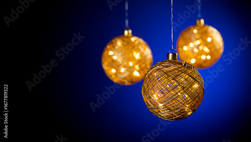 © AbstractZone, Fototapeta premium Festive Golden Christmas Ornaments Against Blue Background