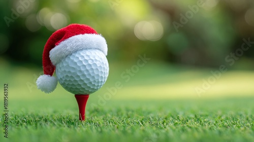 © Oleksandr, Fototapeta premium Festive golf: A golf ball wearing a Santa hat rests on a red tee amidst lush green grass, blending the spirit of the holidays with the love of the game. Holiday cheer on the golf course!